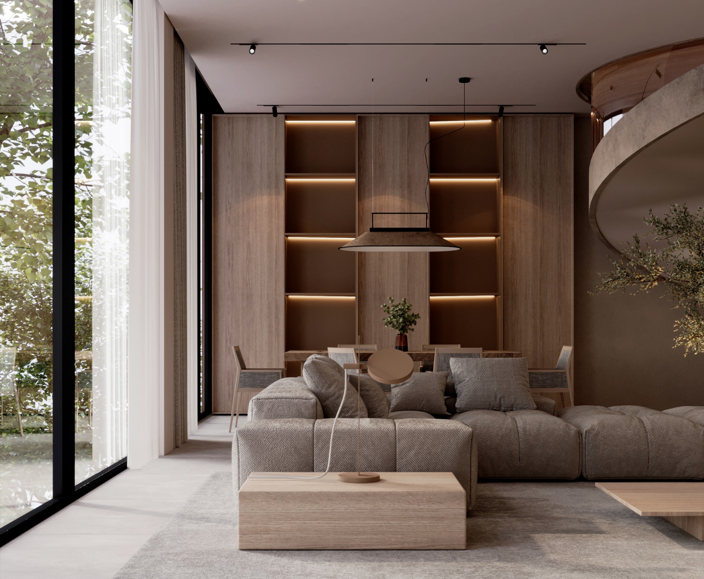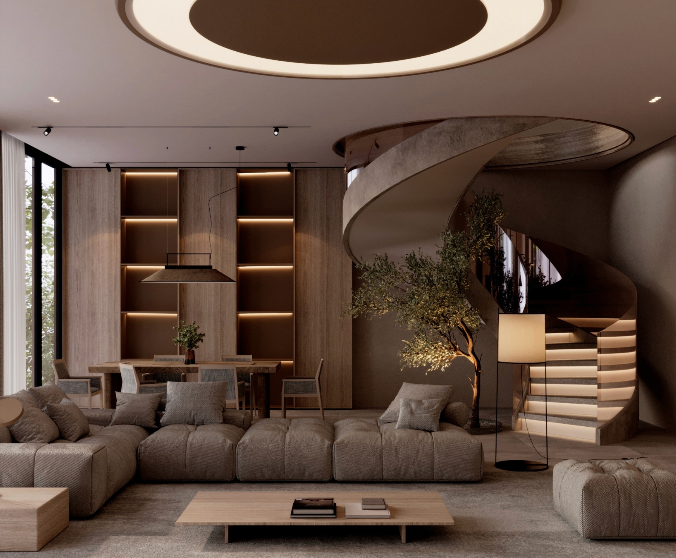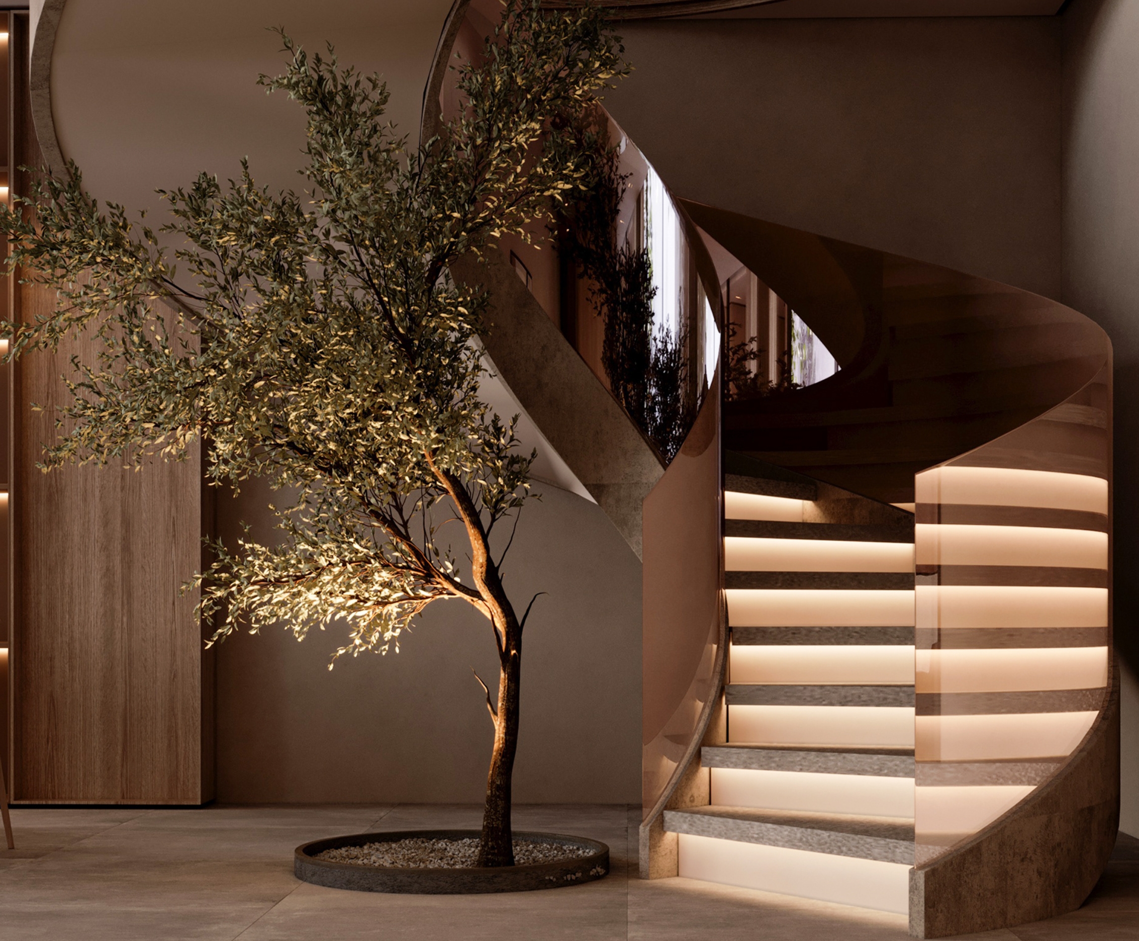 The design aims to create a modern, luxurious space that feels both functional and elegant. The added greenery beneath the staircase enhances the living room’s exquisite feel, tying the natural elements with high-end finishes.