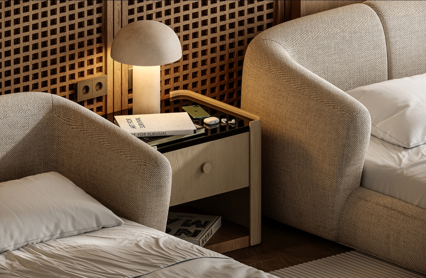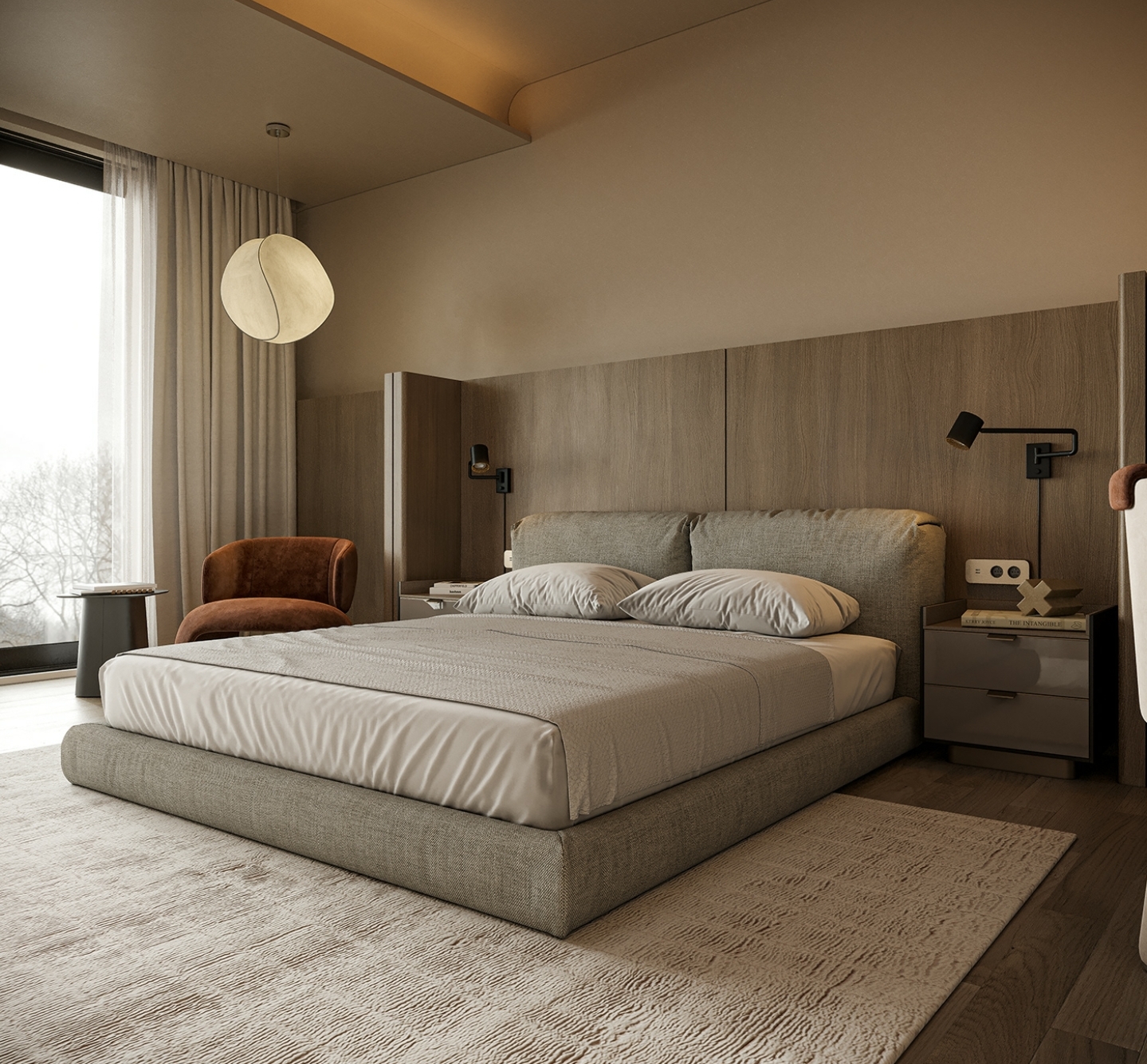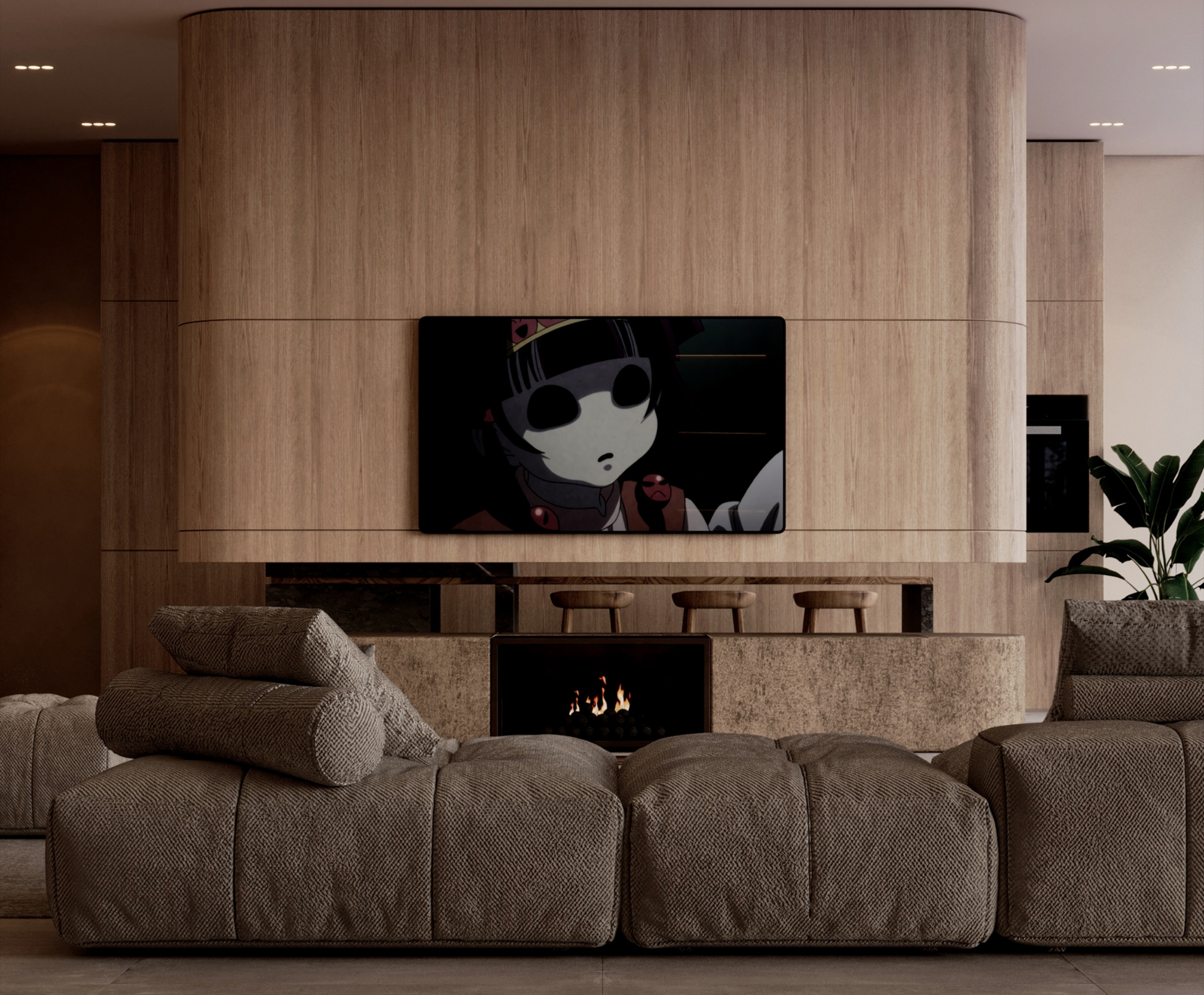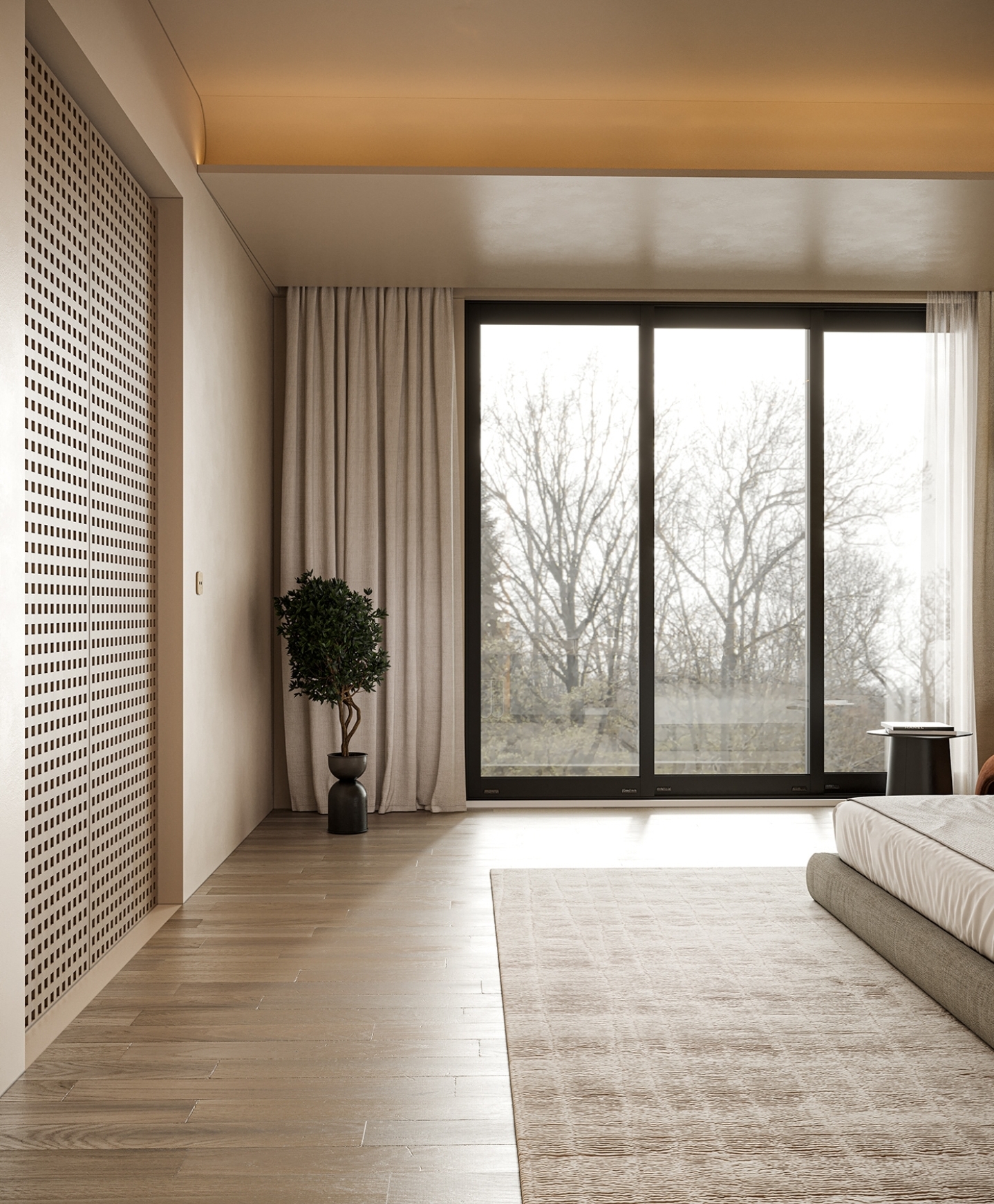The design aims to create a modern, luxurious space that feels both functional and elegant. The added greenery beneath the staircase enhances the living room’s exquisite feel, tying the natural elements with high-end finishes.